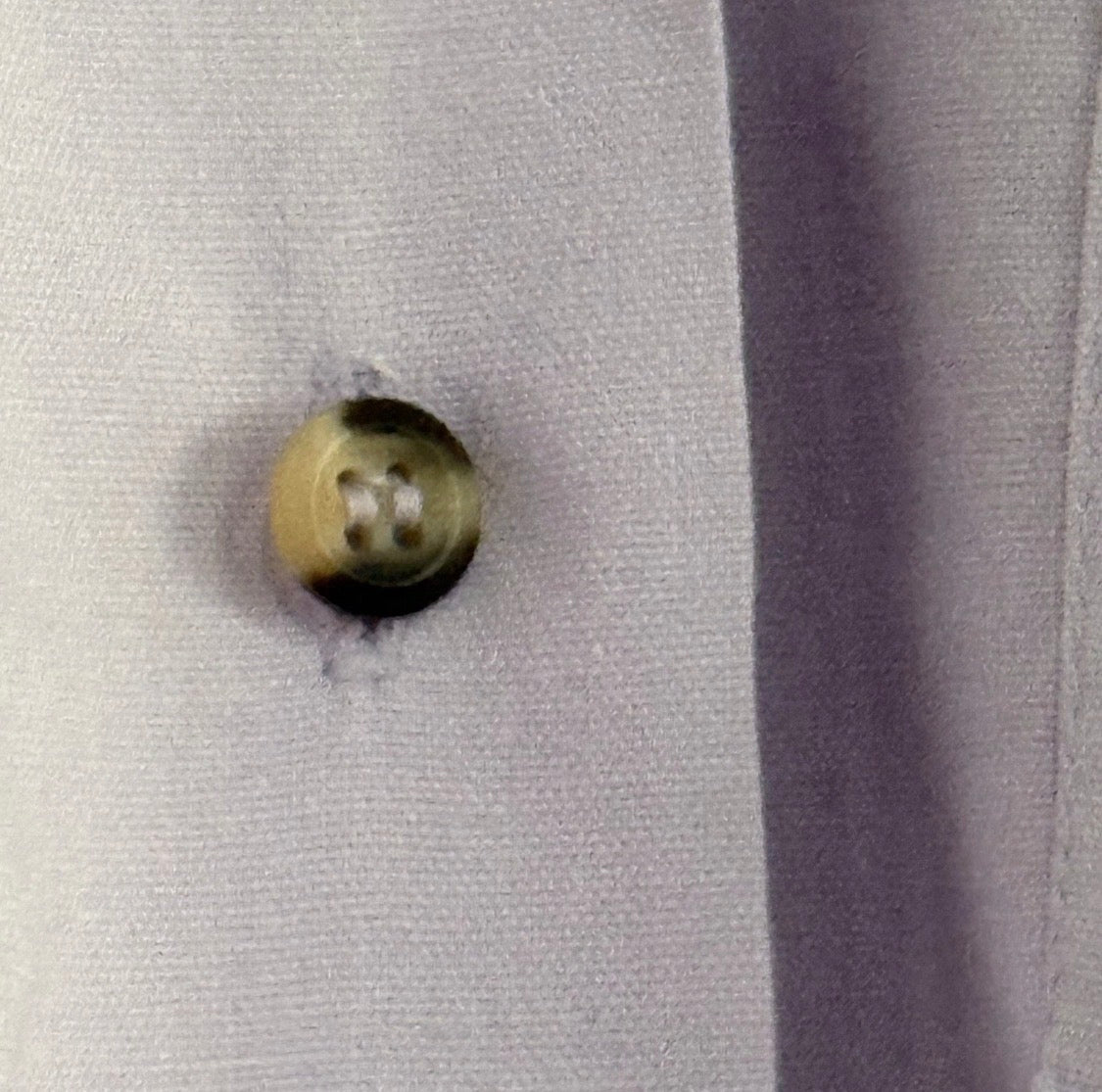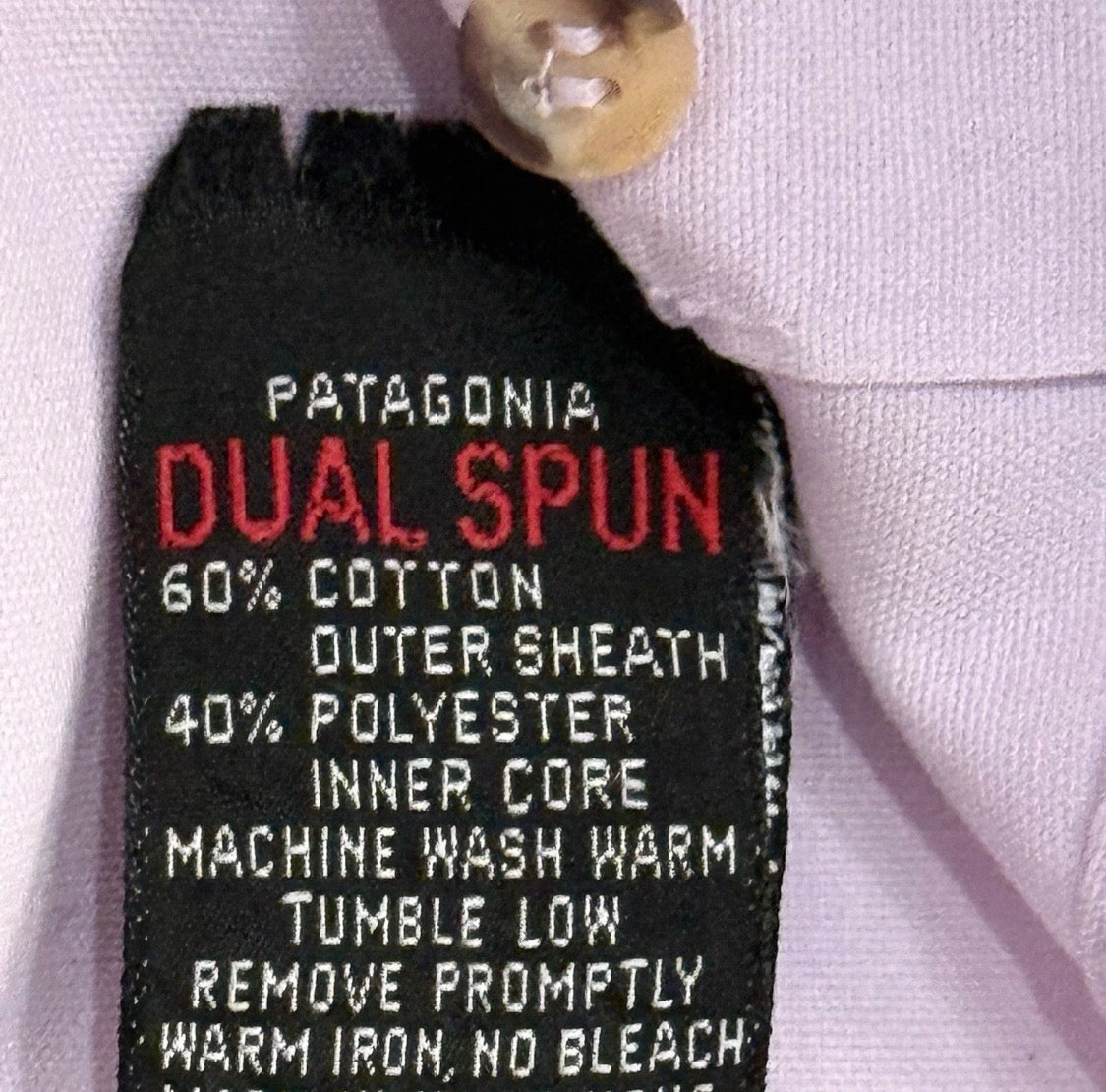 Vintage 1980’s Patagonia Dual Spun Button Up Short Sleeve Pocket Shirt Purple, size 7/8 estimated Small/Medium. Item presented as “good” condition. No rips or tears, all buttons attached. There is one faint stain at collar. Manufacturer tag at inside hem is attached but has been pulled partially off- with no damage to garment. One of manufacturer tags at collar has been cut in a manner to indicate this garment possibly was originally sold as a “factory second.” Reasons for this unknown. See photos.* Color is a light purple or lavender. Manufacturers size is 7/8, estimated as a modern small/medium. Lay flat measurements: Shoulder to shoulder: 15.5” Shoulder to hem: 23.5” Chest: 19” Bottom opening: 20” Sleeve length: 9” Sleeve opening: 7” Pocket dimension: 4.5” x 5” Item is true vintage and sold “As is.” No refunds or exchanges. Thanks for looking |
