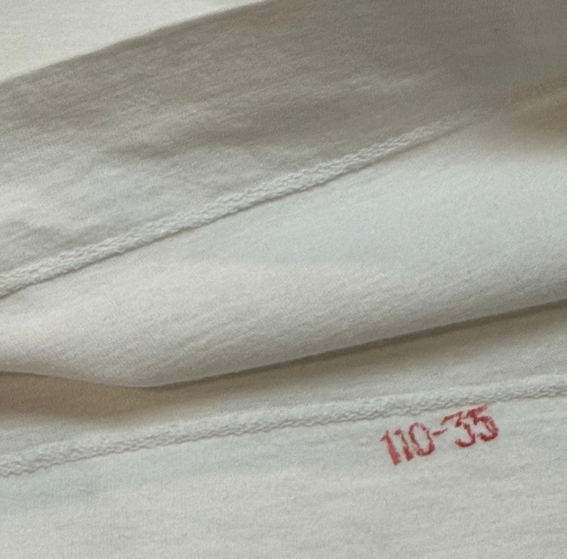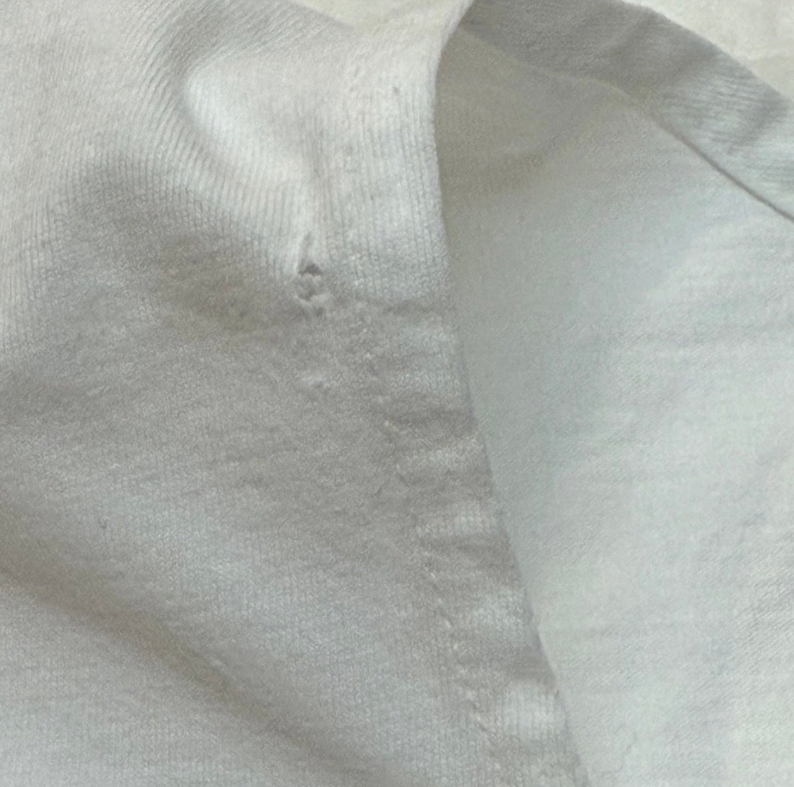 There is a red manufacturer stamp at back hem, can be seen thru during wear. There is a small orange stain also on back him- possibly rust.