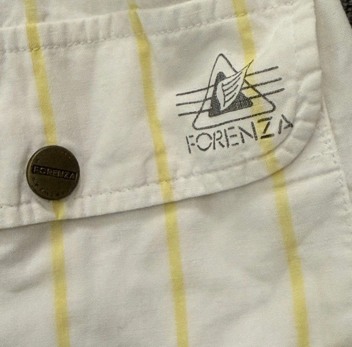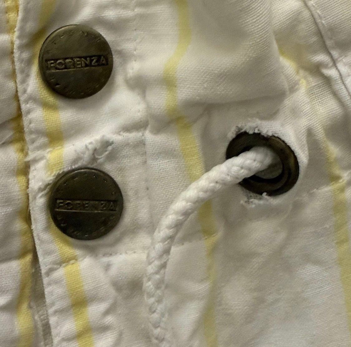 Vintage 1980s Forenza High Rise White Yellow Stripe Shorts, Women’s Small. In good condition, some signs of wear around buttons , (see photos.) Also, drawstring is missing plastic piece at end of one side. Some minor dark spots on back pocket.