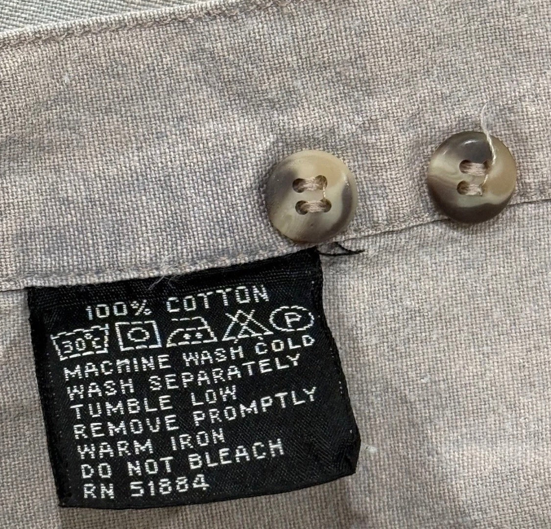 Item is marked as “good” condition. One small stain at center rear hem. See photo. Had no rips or tears, all buttons are affixed. Signs of wear and natural fade.
