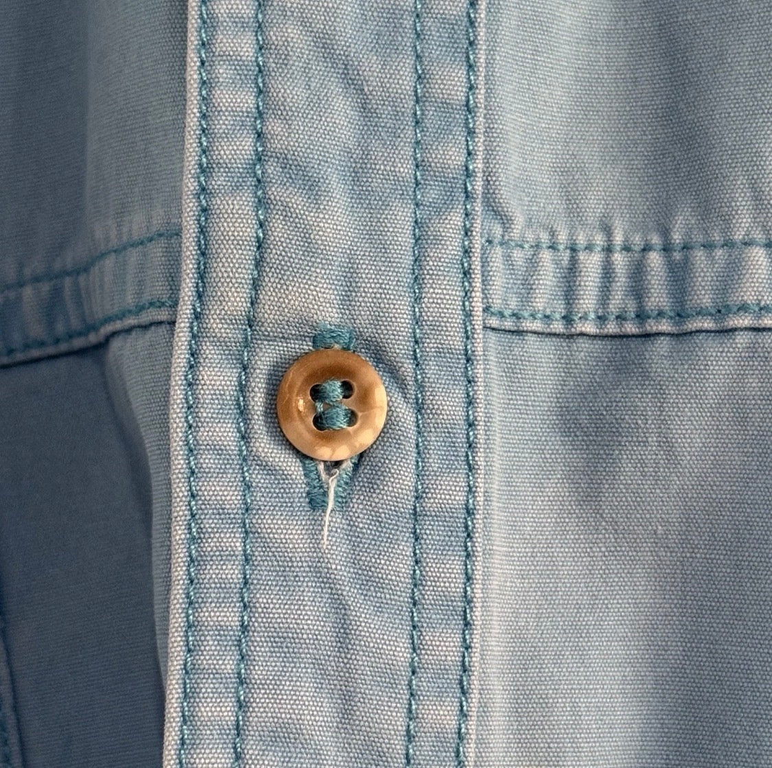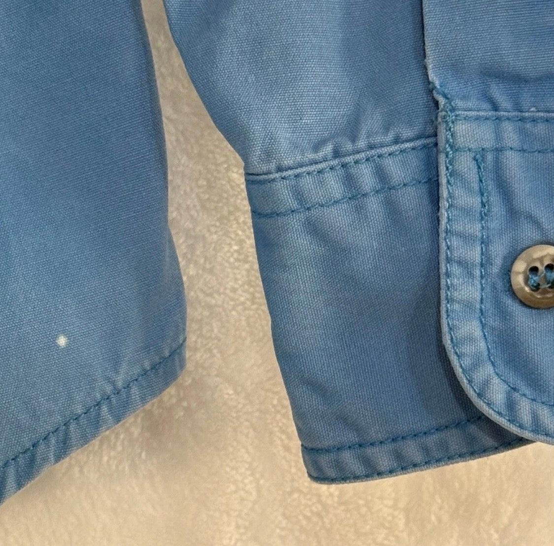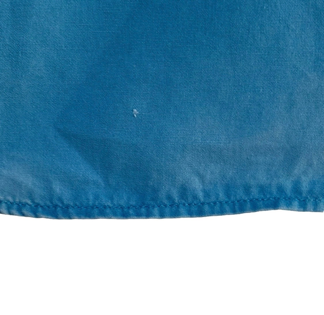 No rips or major tears. At back center hem there is a very small snag- see photo. Also at rear right hem there is a small dot consistent with bleach. Both flaws would be hidden if tucked into pants. There is some light staining/possibly specs of bleach on front, near pockets. Some fading is present. All buttons are original and attached.