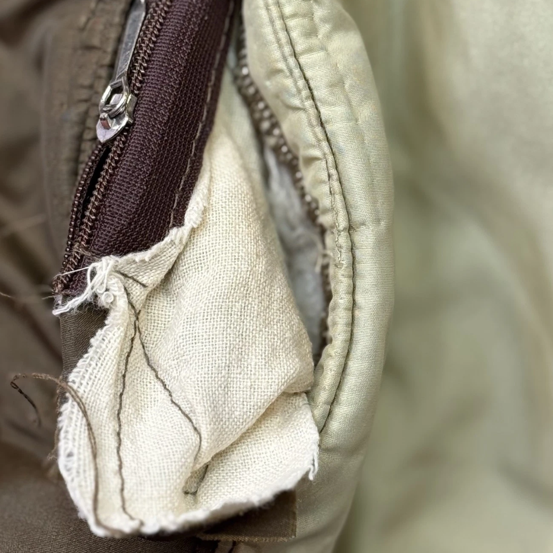 The major repair issues are with front pockets- it appears as though during wear someone uséd the pockets often, causing the inner pocket fabric to pull away from the outer shell. The right pocket is the worst, in need of substantial repair & the left could use a stitch or two for prevention- it looks like it’s starting to do the same.