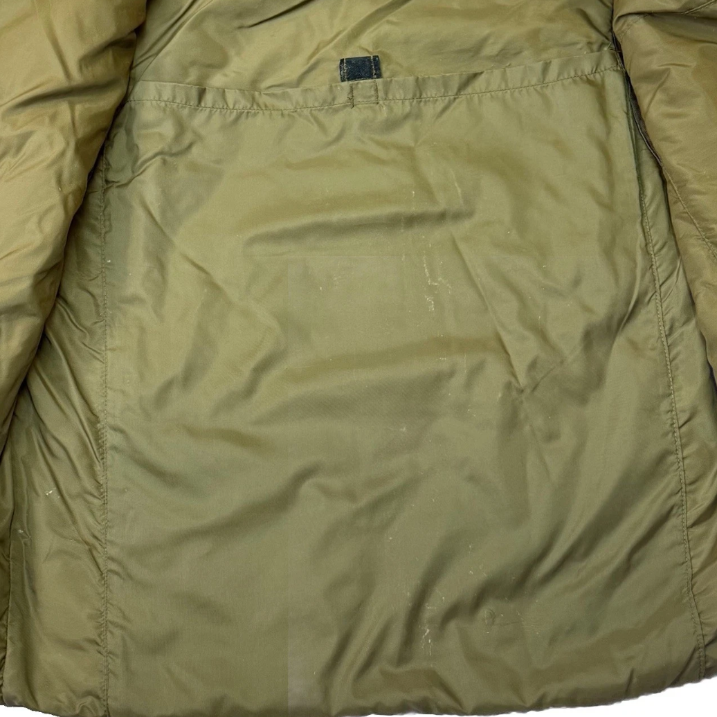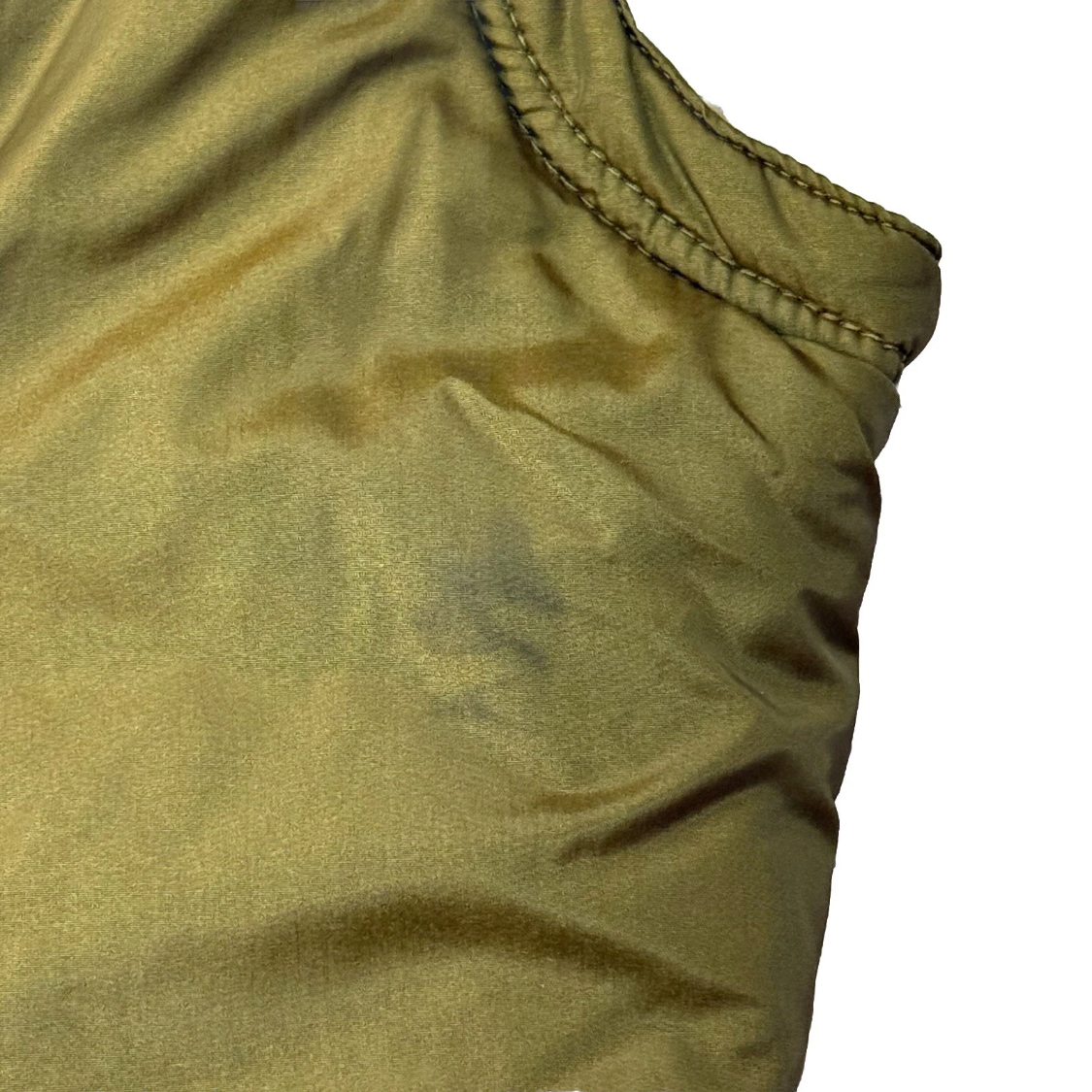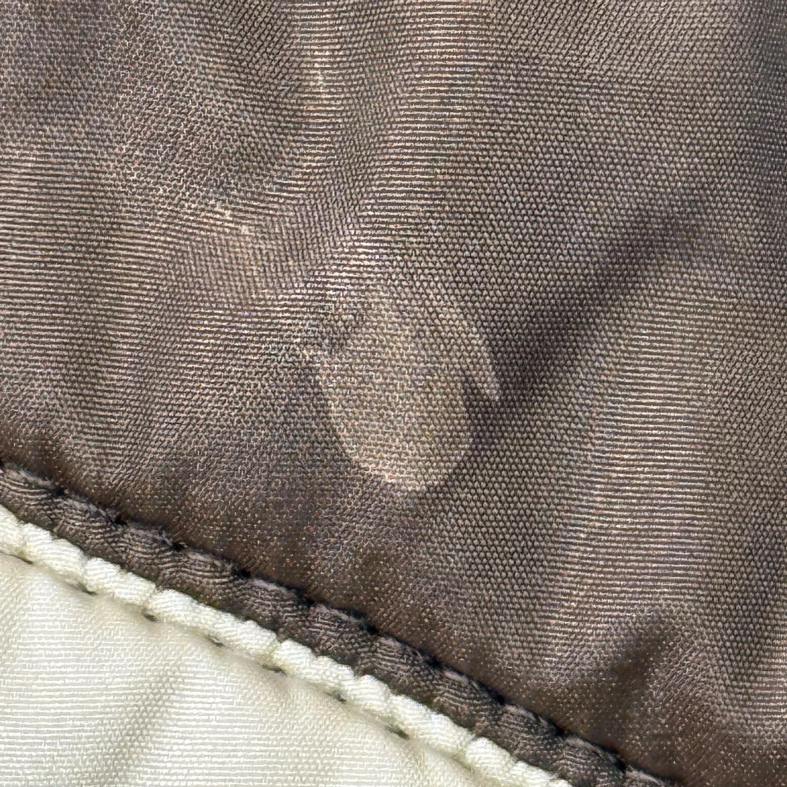 There is some discoloration/staining (see photos)- the most unfortunate one on the chevron front chest. There is a slightly noticeable dark stain on the back beneath right shoulder blade on outer shell, & some light & dark staining on inner liner.