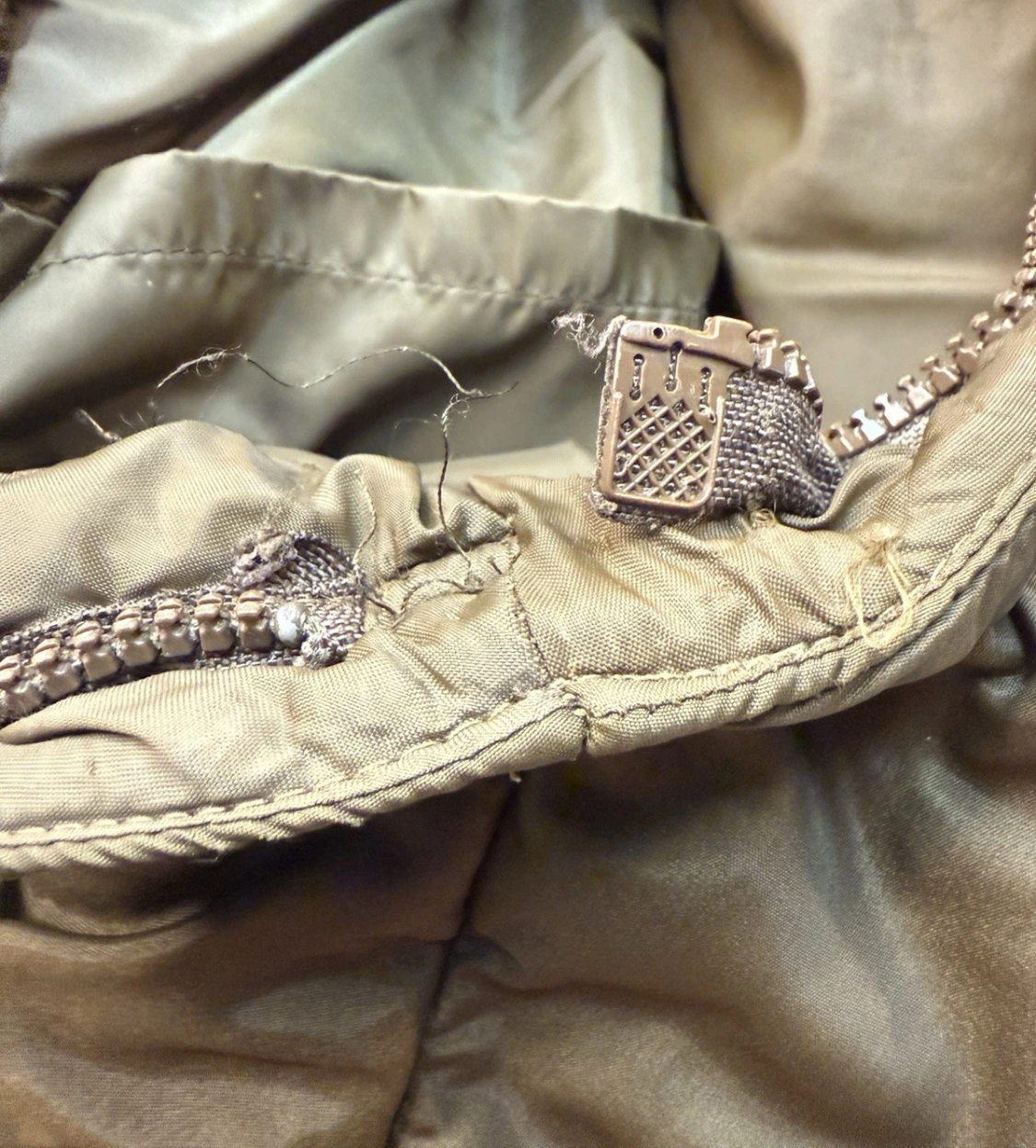 There also is wear between zipper and inner chest pocket, consistent with the wearer reaching in. The left front pocket metal zipper pull is missing.